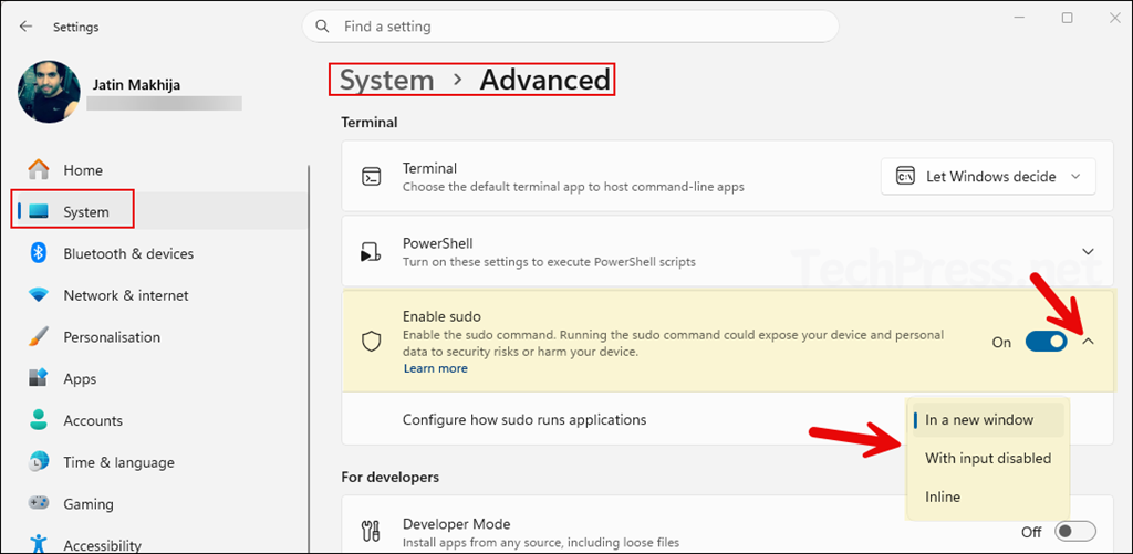 In this guide, apart from showing you how to enable or disable Sudo, I will also show you its available modes and cover the different ways to manage it from settings, command line, and registry. The Sudo setting is under the Settings > System > Advanced. On Windows 11 version 25H2 and later devices.