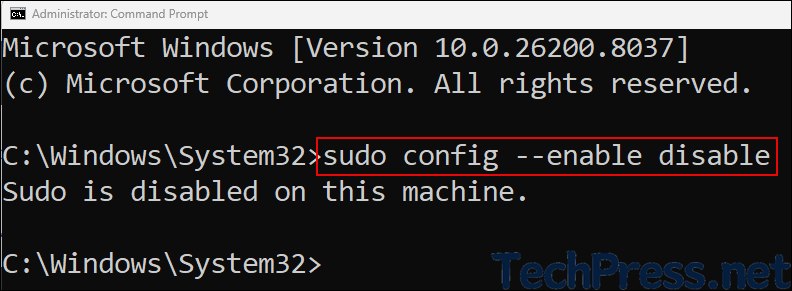 Alternatively, you can open a command prompt as administrator and run below command to turn off or disable Sudo.