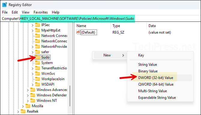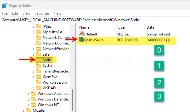 - Navigate to HKEY_LOCAL_MACHINE\SOFTWARE\Policies\Microsoft\Windows\Sudo and create a DWORD registry entry called EnableSudo and set its value to one of the below: