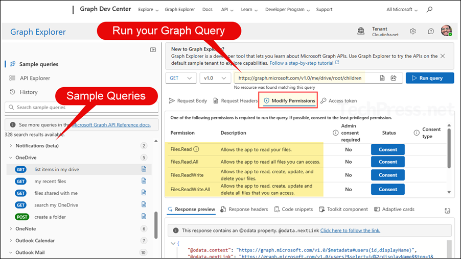 To determine which permissions are needed for a specific task, run your query in Graph Explorer and then click Modify permissions. It will show the permissions required to execute the query. Whenever possible, choose and consent to the least-privileged permission. You don’t need to use all the listed permissions, use the least permissive permission and then step-up if needed.