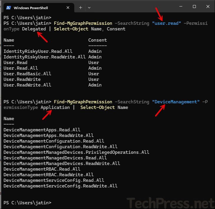 The following commands use the Find-MgGraphPermission cmdlet to search for a string and return a list of all matching permissions that can be used with the -Scope parameter.