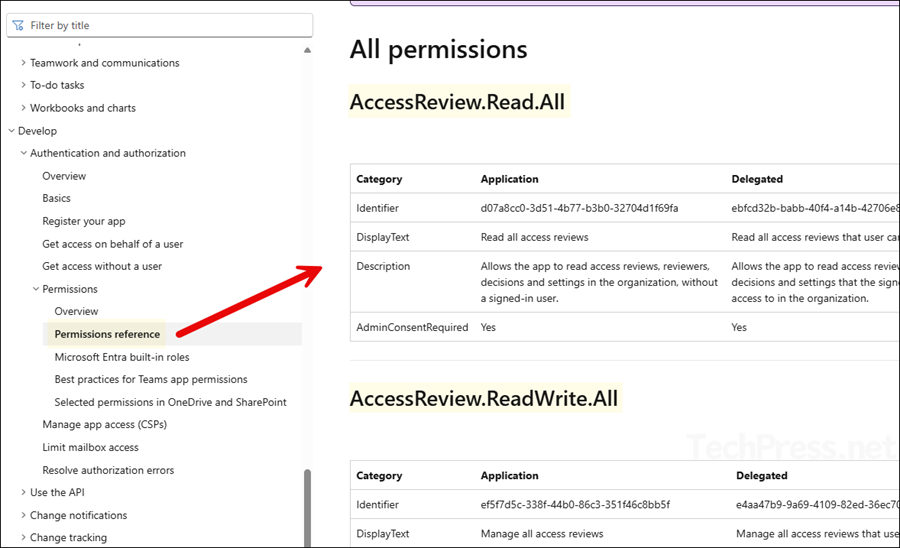 Refer to Microsoft’s documentation permissions reference page which includes all the permissions with their identifier, display name, description, consent requirements, and type (Delegated or Application). Use Ctrl+F to find the permission you require, then review its description to confirm if it fits your scenario.