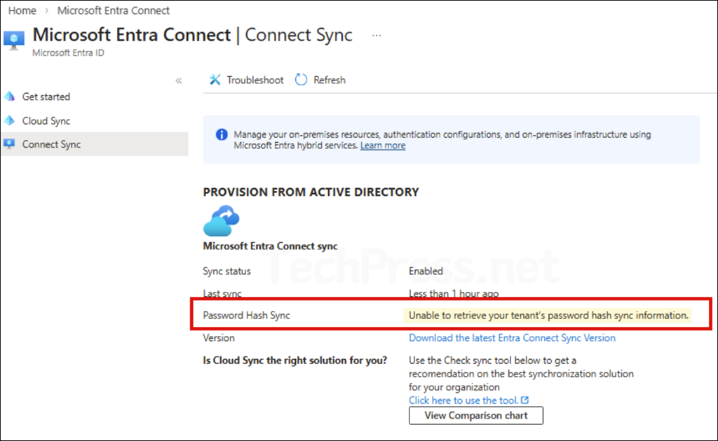 If you open Microsoft Entra Connect or the Entra admin center and see the message “Unable to retrieve your tenant’s password hash sync information”, it can look like Password Hash Synchronization (PHS) has failed. In many cases, however, the issue is not an actual sync outage. It is usually caused by missing permissions to view the status, missing Microsoft Entra Connect Health access, or a Connect Health sync agent that is not properly registered or reporting.