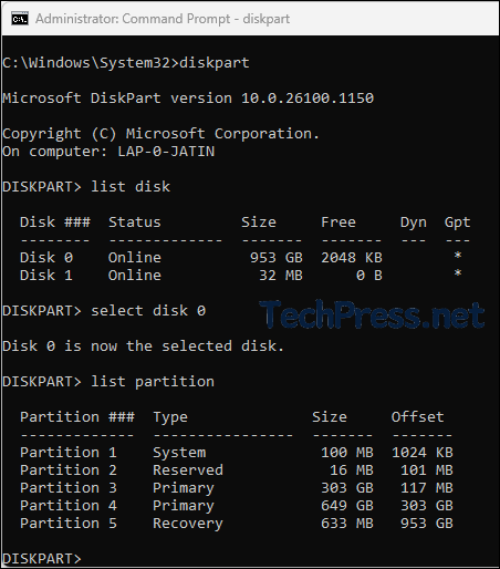 | 5 | format quick fs=fat32 label=”System” | Format the EFI partition as FAT32. |